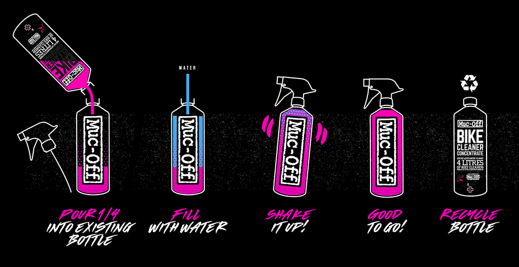 Wiederverwendung ist noch umweltfreundlicher als Recycling. Deshalb haben wir beschlossen, ein Konzentrat des preisgekrönten Reinigers zu entwickeln. Die Idee dahinter ist, dass man seine alte Flasche und den Sprühkopf weiterverwendet und den Bike Cleaner einfach nachfüllt.