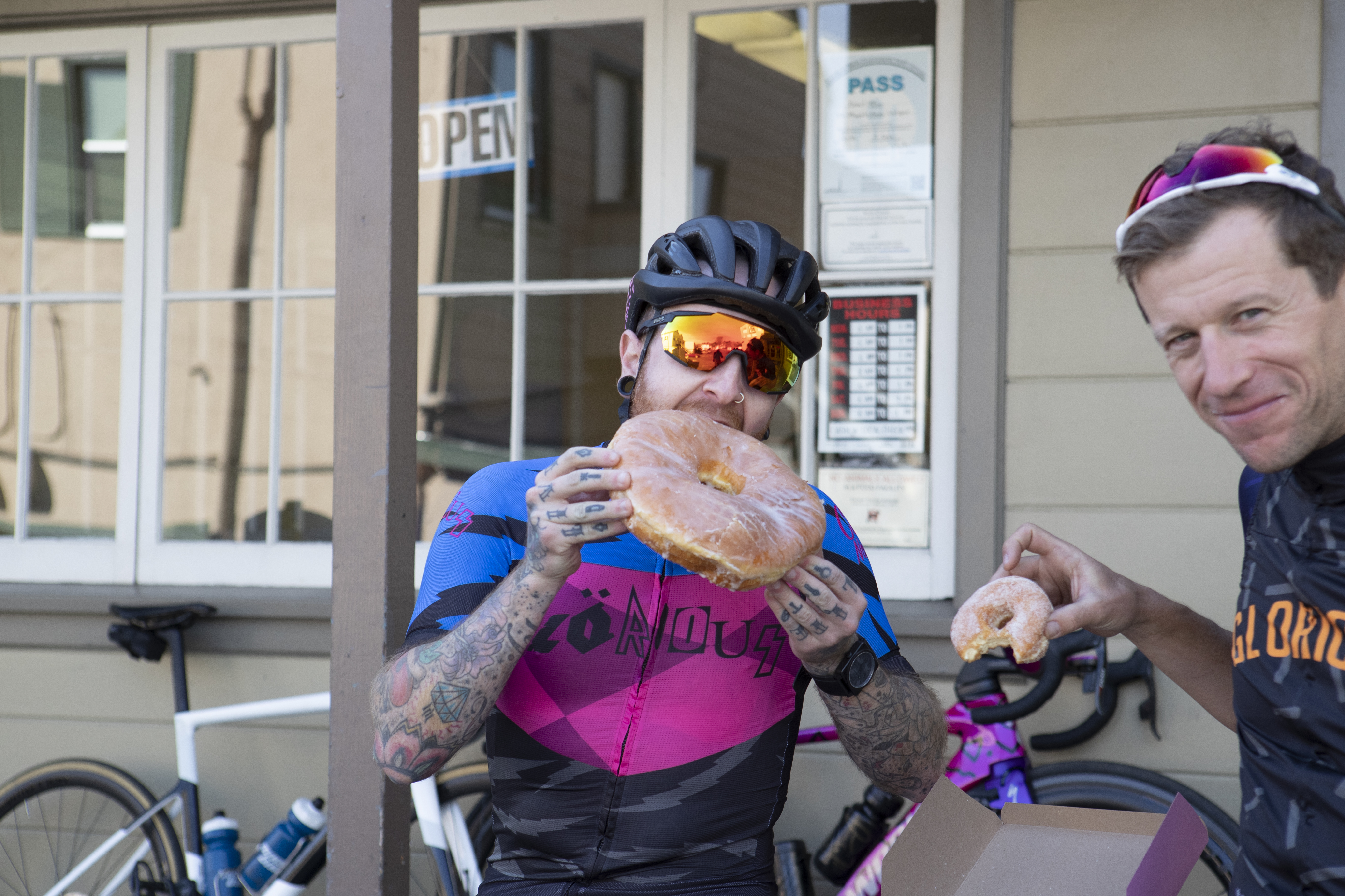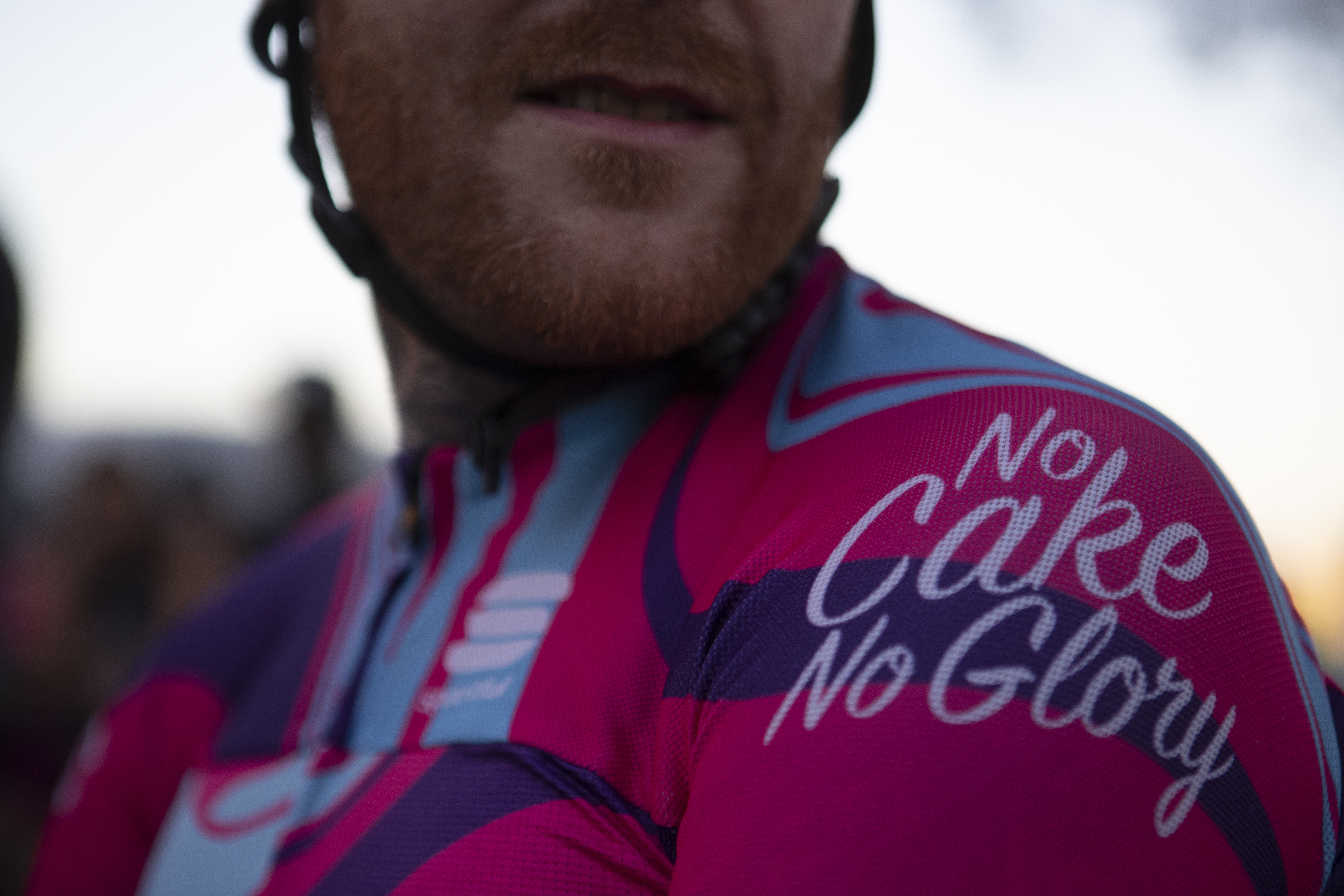 Trifft man Matt bei einer Ausfahrt, merkt man schnell, dass er seine Kreativität nicht nur bei Muc-Off, sondern vor allem auch in seiner Freizeit auslebt. Kit, Helm, Fahrrad, Socken, sogar die eigene Haut – alles ist selbst designt und trägt Matts Handschrift. Als Mr. Glorious begann er 2015 eigene Kits zu designen, weil er es leid war, eine Werbefläche für andere Leute und Marken zu sein. So entstand Glorious.cc und damit eine Community für Radfahrer, die zwar einerseits die sportliche Herausforderung lieben, aber andererseits niemals zu Kuchen nein sagen würden. Abgewandelt von „No guts, No glory“ folgt da Matts Lebensmotto „No cake, No glory“ sehr passend. Besonders mag er Donuts, die klassischen mit Zuckerguss oder „Glazed Oreo cookies and cream“.